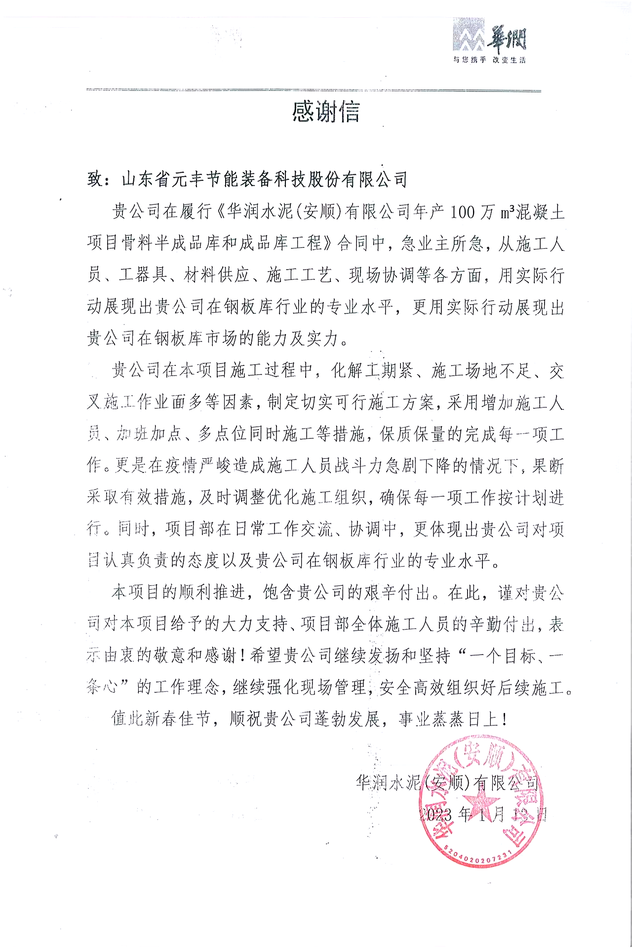 信中指出,贵司在履行《华润水泥(安顺)有限公司年产100万m3混凝土项目骨料半成品库和成品库工程》合同中,克服工期紧、施工场地不足、交叉施工作业面多等不利因素,制定切实可行施工方案,采取有力措施,保质保量的完成每一项工作。在此,谨对贵公司对本项目给予的大力支持、项目部全体施工人员的辛勤付出,表示由衷的敬意和感谢!希望贵公司继续发扬和坚持“一个目标、一条心”的工作理念,继续强化现场管理,安全高效组织好后续施工。